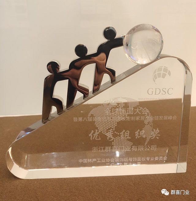 群喜門業專注為年輕人打造高品質的現代生活方式,原創設計,多年來公司始終采用德國夏特面板,堅守健康環保的理念。在此次大會上,群喜門業不負眾望,在數百名行業大咖及1000多名企業代表的見證下,榮獲了“優秀組織獎”。