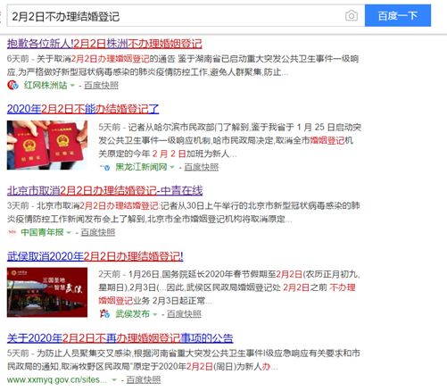 之前多地的民政部門發通知,應大新人的要求,在2月2日這一天上班辦理結婚登記,但由于突如其來的疫情,全國各地紛紛取消了這一決定。
